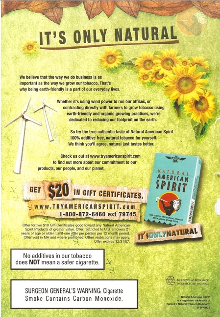 - Ad for American Spirit cigarettes, Discover Magazine, 5/2007, p. 5. Mischa Barthel sent the following criticism of this example: