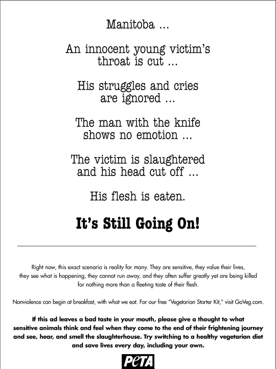 PETA is back to its old trick of drawing question-begging analogies between humans and other animals. In the past, they drew detailed parallels between the treatment of animals and both human slavery and the Holocaust. Now, the parallel is between a recent, horrendous murder that took place in Manitoba and the killing of animals for food. All of these analogies beg the question because, to have any moral force, nonhuman animals must be morally similar―if not morally equivalent―to human ones, which is something that most of the target audience for the ads would deny.